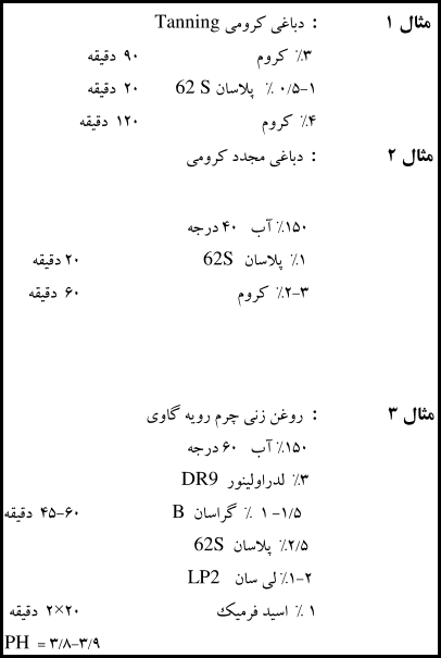 محدوده كاربرد : پلاسان 62S در مراحل اسيدي ، دباغي كرومي ، دباغي مجدد كرومي و همراه با روغنهاي ديگر در روغن زني اصلي جهت انواع مختلف چرم مصرف ميشود.